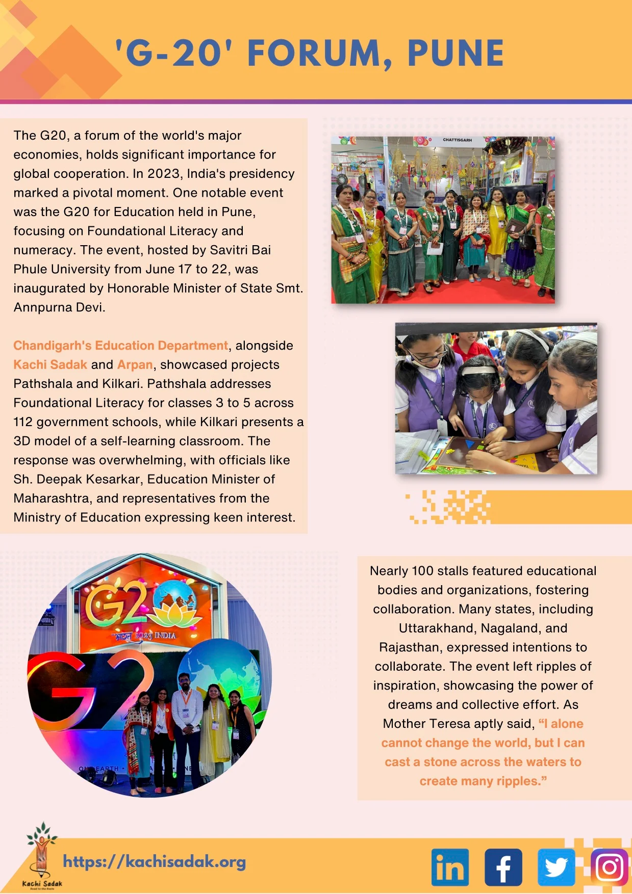 In collaboration with Arpan Trust, we were honored to present our Paathshala and Kilkaari programs—focused on Foundational Literacy & Numeracy (FLN) skills and Early Childhood Education—at the G20 Summit Pune 2023, alongside the Department of Education, Chandigarh.